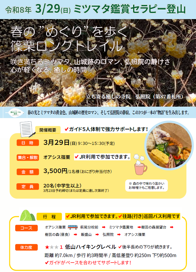 ◆行程:オアシス篠栗~ミツマタ鑑賞地~樹芸の森展望台~飯盛山~弘照院~オアシス篠栗